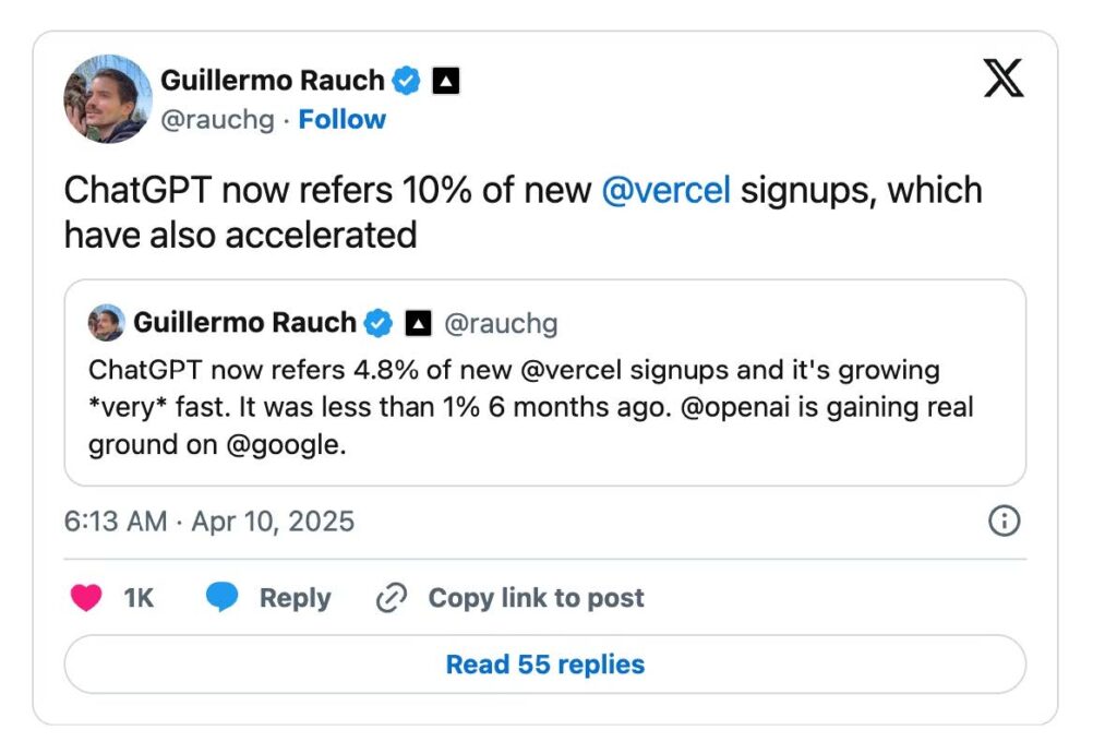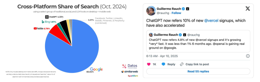 AI is increasingly influencing every part of marketing, including the starting point of how people look for information and how marketers conduct their day-to-day marketing activities. Last year, Rand Fishkin, co-founder and CEO of SparkToro, shared a chart on X that sparked wide discussion across the industry. While the data was, as he openly admitted, “messy”, it offered one of the clearest snapshots of where search traffic was heading — showing that ChatGPT had already taken 4.33% of search activity. The conversation gained further momentum this April when Vercel CEO Guillermo Rauch revealed that 10% of Vercel’s new signups now come from ChatGPT referrals.